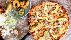 We tucked into their famous Mediterranean Grill Seafood Platters, loaded with grilled hake, prawns, mussels, seafood kebabs, and the dreamiest peppadew-and-prawn phyllo pastry. On the side? Chips, veggies, rice, and three of their signature house-made sauces. But the table didn’t stop there; pizzas arrived, too. The veg-friendly Gourmet Pizza with butternut, spinach, onion, feta, rosemary balsamic reduction, and avocado. The Thai Prawns & Calamari Pizza with prawns, calamari, mushrooms, pickled ginger, fresh coriander, and balsamic drizzle. The Al Franco with salami, feta, capers, and calamata olives. And the famous Durbs Pizza, fillet steak topped with a creamy curry sauce and avocado (my personal favourite!).